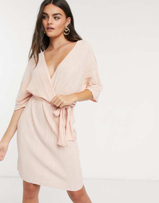 Y a s wrap mini dress with kimono sleeve in pale pink plisse.